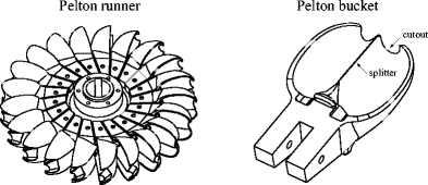 The water jet strikes the double-cupped buckets on the Pelton wheel. As an impulse turbine, energy conversion occurs before water contacts the runner.