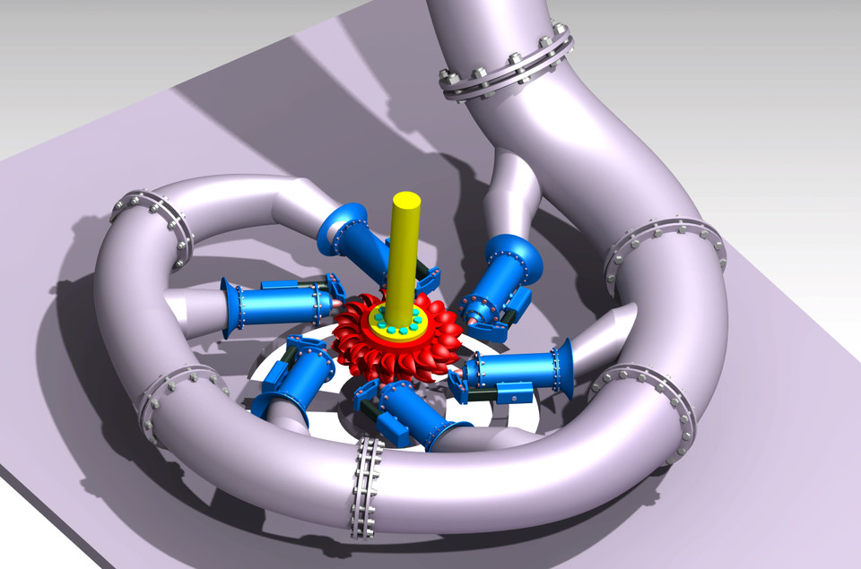 Pelton turbines are ideal for mountainous regions, where rivers descend from great heights but have relatively low flow rates.