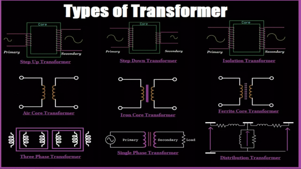 - Single-Phase Transformers: Used in small-load or auxiliary circuits.