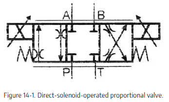 Figure 14-2 shows the simplified symbol for a solenoid pilot-operated proportional valve. Figure 14-3 shows the complete symbol for the same valve. The complete symbol includes details of the control and slave valves, the reducing valve in the pilot circuit, and the routing of the pilot lines.