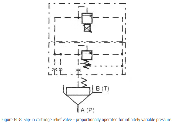 Figure 14-8 depicts the symbol for a slip-in cartridge relief valve. When flows go above 150 to 200 gpm, use a slip-in cartridge relief valve with a direct-acting proportional relief pilot. These cartridge valves come in stand-alone bodies or as part of a special high-flow manifold.